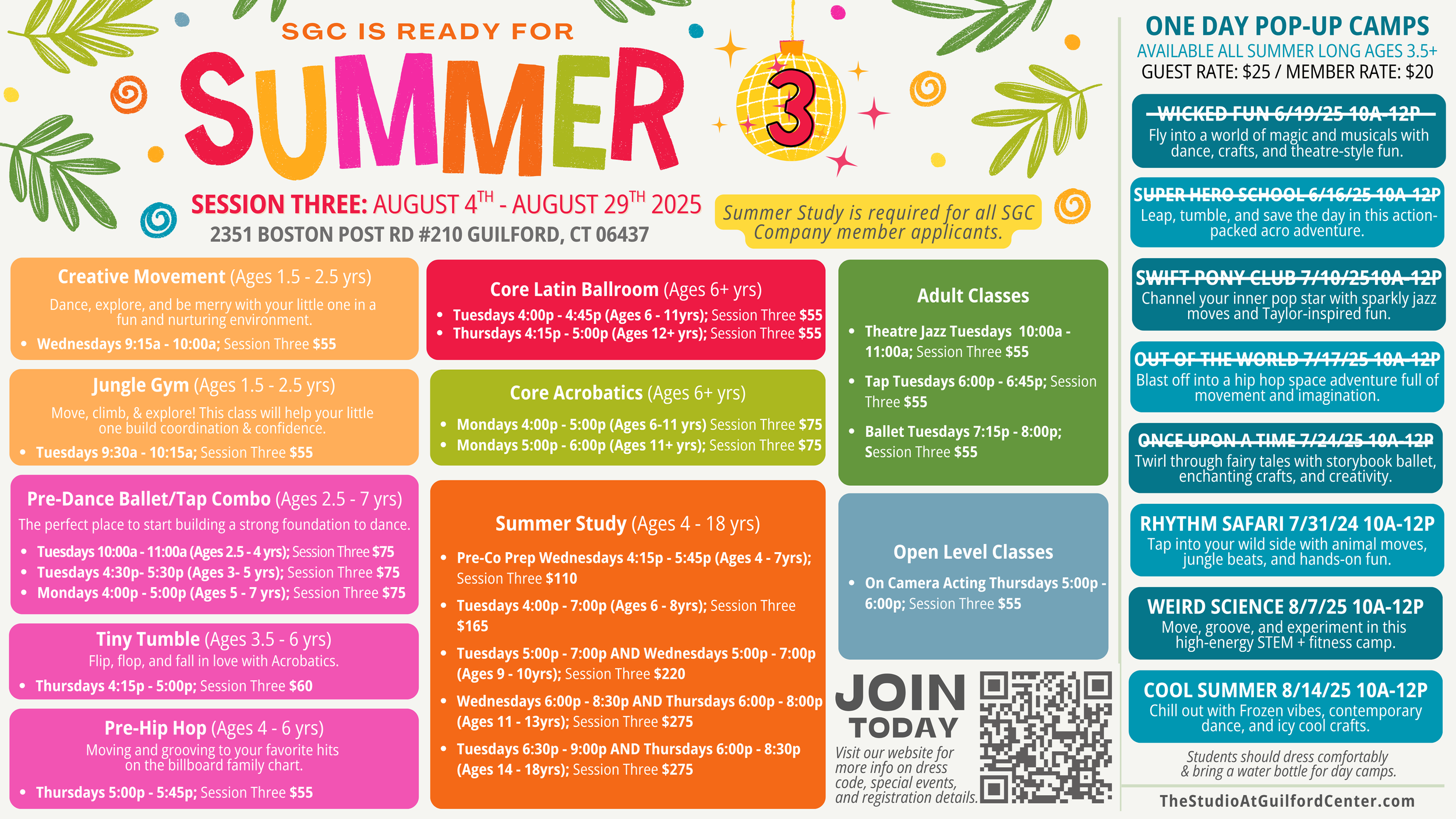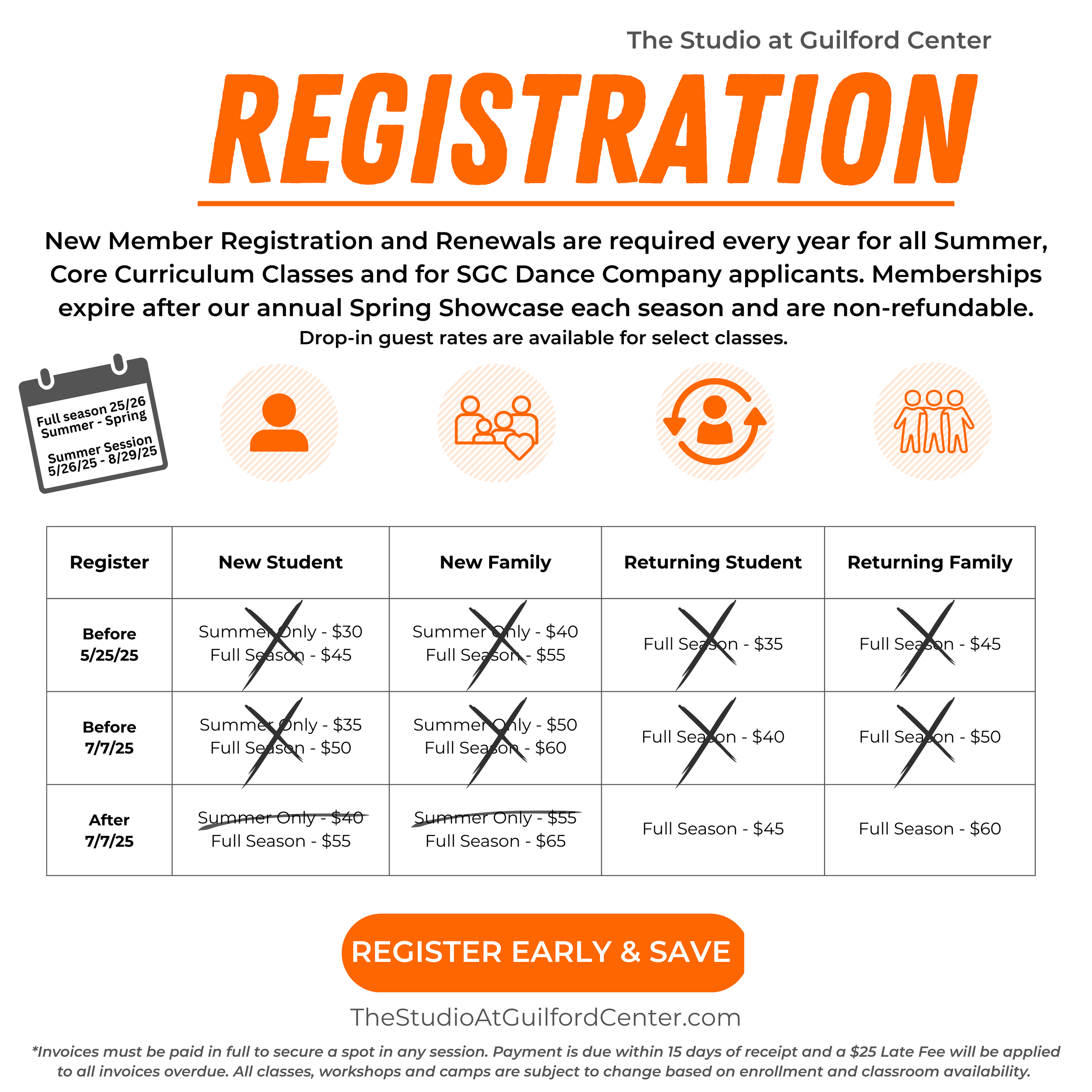 Registration & Membership: Annual registration is required for all Core Curriculum Classes and SGC Dance Company applicants. Memberships expire following the Spring Showcase each season and are non-refundable.
